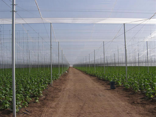 Pilares distanciados por 10m em madeira de 15 a 25m/m, ou tubo galvanizado a quente por imersão de 70x 3m/m com 3m de pé direito.